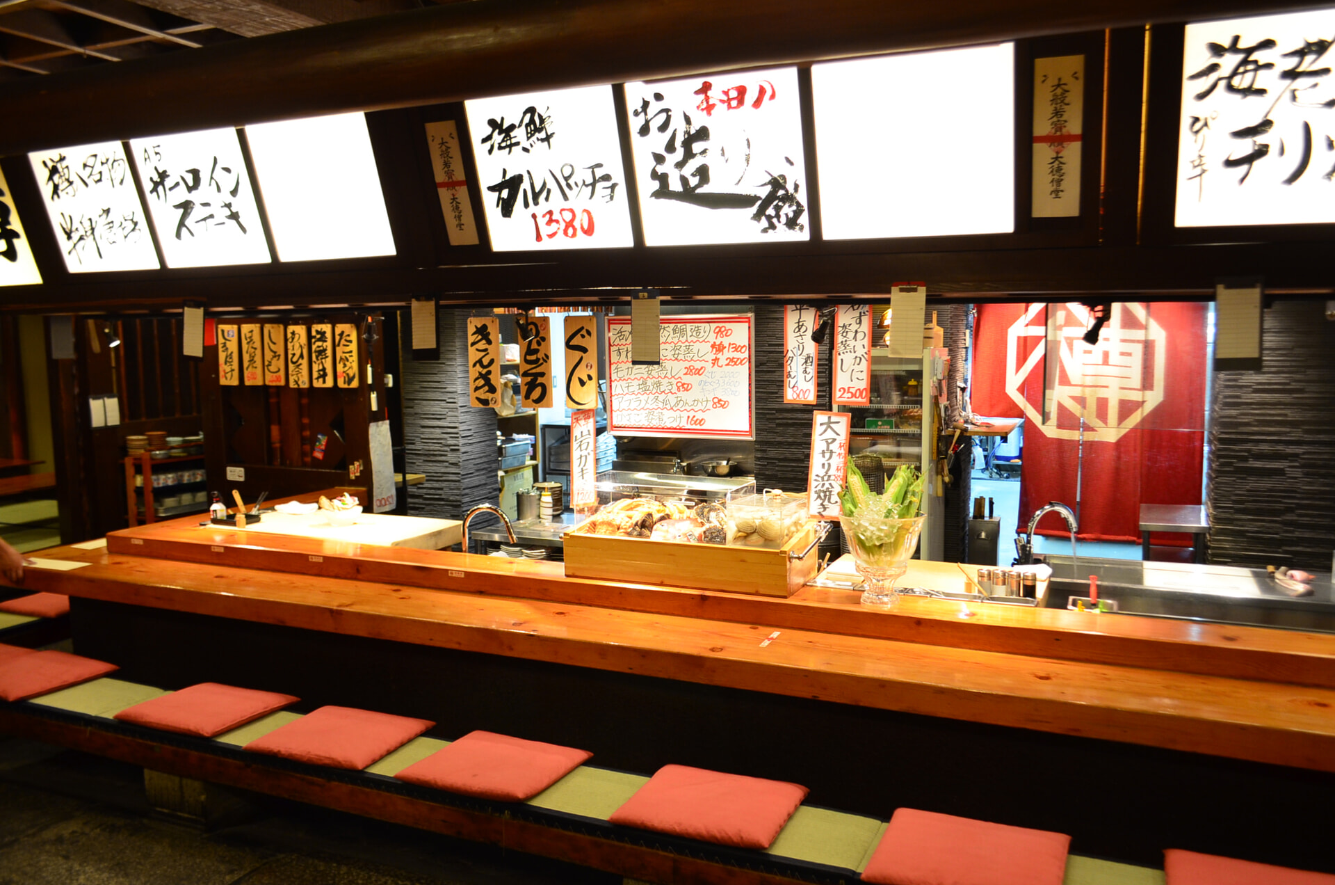 ライブ感あふれるカウンターには当日入荷した鮮魚たちが並びます。